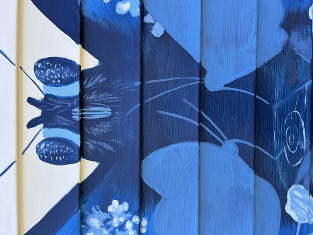 This mural shows the full lifecycle of this incredible butterfly who feeds on keystone tree species like oaks and cherries as a caterpillar. It even rolls itself in a leaf to overwinter, called a hibernaculum. I painted leaves being eaten, by the caterpillar who looks like bird poop. It is related to the White Admiral butterfly and a mimic of the Pipevine Swallowtail.